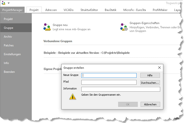 Öffnen Sie im Systemmenü des Projektbrowsers die Rubrik "Gruppe" und klicken Sie auf die Schaltfläche "Gruppe neu". Es wird ein Dialog geöffnet. Geben Sie dort den Namen der Gruppe, den Pfad und ggf. weitere Informationen zur Gruppe an.