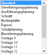 Über die Auswahlmenü wird die Darstellung der aktuellen geändert. Es stehen 8 Standard-Darstellungen (wie z.B.: Genehmigungsplanung oder Exposé) zur Verfügung. Weitere 8 Vorlagen (Vorlage 9 - Vorlage 16) können vom Benutzer frei definiert werden.