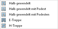 Über diese Auswahlschaltfläche können verschiedene halbgewendelte Treppen erzeugt werden. Die Standardeinstellung ist 'halb gewendelt'. Eingabeoptionen stehen in der Optionenleiste zur Verfügung.