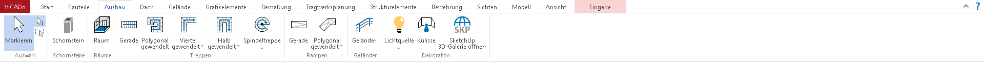 Die Gruppe "Auswahl" dient zum Markieren bzw. Selektieren von Objekten. Sie hat somit eine zentrale Bedeutung und ist deswegen in jedem Register an dieser zentralen Stelle verfügbar. Mit der Funktion "Markieren" selektieren Sie Objekte. Außerdem können Sie alle Objekte gleichzeitig markieren sowie das Anzeigen von Tooltips aktivieren oder deaktivieren. Mehr zur Gruppe Auswahl...
