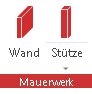 Erzeugt ein- und mehrschalige gerade Wände aus Mauerwerk, schräge und gebogene Wände mit beliebiger Wanddicke. Die Höhen- und Parameterinformationen jeder Schale (Höhe, Dicke, Niveau und Material) sowie der Neigungswinkel für schräge Wände werden über die Eigenschaften definiert. Es können vorhandene Vorlagen in der Optionenleiste ausgewählt oder neue Vorlagen erstellt werden. Die konstruktive Eingabe der geraden bzw. schrägen Wände kann bei Einzelwänden durch den Anfangs- und Endpunkt einer Strecke oder bei einem Wandpolygon durch die Punkte eines offenen bzw. geschlossenen Polygons, die der runden Wände über den Mittelpunkt sowie den Anfangs- und Endpunkt eines Kreisbogens erfolgen.