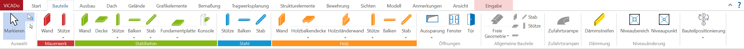 Die Bauteile sind im Menüband in Gruppen sortiert. Wo es möglich ist, erfolgt die Sortierung nach Werkstoff.