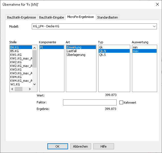Einzelwertübernahme - Register BauStatik-Ergebnisse