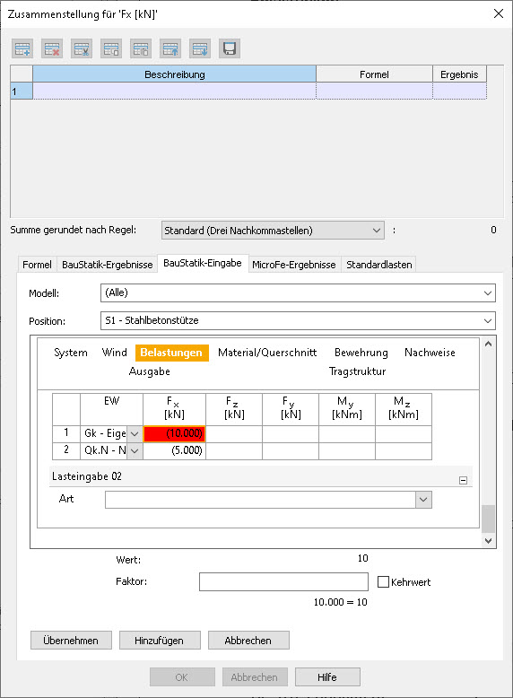 Lastzusammenstellung - Register BauStatik-Ergebnisse