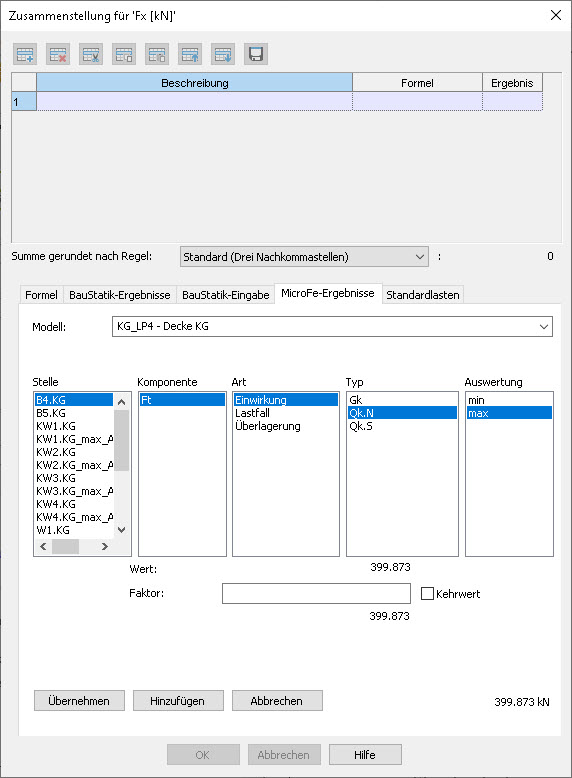 Mit dem Schalter "Hinzufügen" fügen Sie das konfigurierte FE-Ergebnis nach der aktuellen Zusammenstellung-Zeile ein. Sie bleiben weiterhin im Übernahme-Modus, sodass weitere Ergebnisse hinzugefügt werden können.