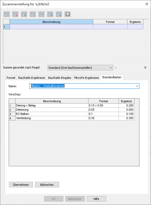 Mit dem Schalter "Auflösen und Übernehmen" übernehmen Sie die gewählte Standardlast als einzelne Formel-Zeilen ab der aktuellen Zusammenstellung-Zeile ein.