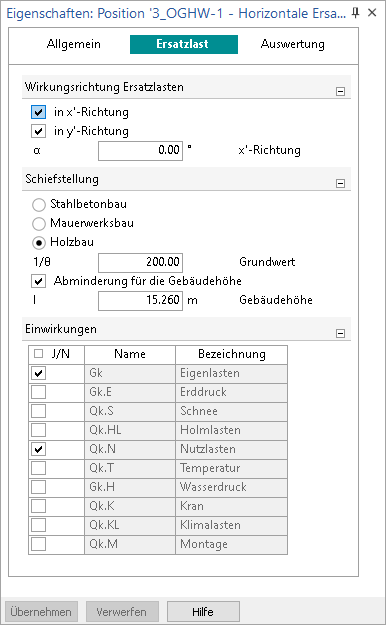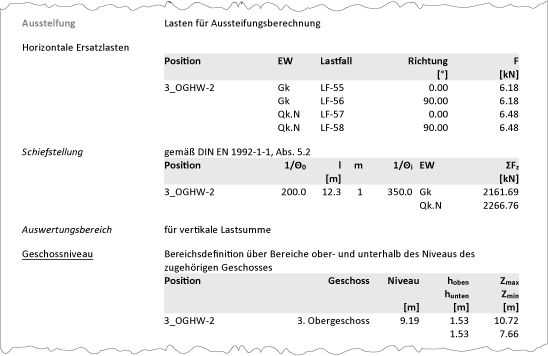 Einflüsse aus unplanmäßiger Imperfektion werden bei einer Aussteifungsberechnung durch Ersatzlasten berücksichtigt. Der spezielle Lastpositionstyp "Horizontale Ersatzlast" des M130.de erfasst die Vertikallasten in einem definierten Auswertungsbereich. Mit den entsprechenden Vorgaben zur Schiefstellung werden die Ersatzlasten automatisch ermittelt.