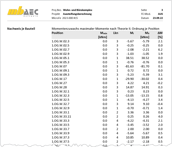Als bemessungsmaßgebende Auswirkungen werden im Modul M130.de die Momente an Wand- und Stützenfuß betrachtet. Im Rahmen der Nachweisführung werden die Einspannmomente nach Theorie I. Ordnung den Einspannmomenten nach Theorie II. Ordnung gegenübergestellt. Der Nachweis wird bei einem Zuwachs kleiner als 10 % als erfüllt angesehen.
