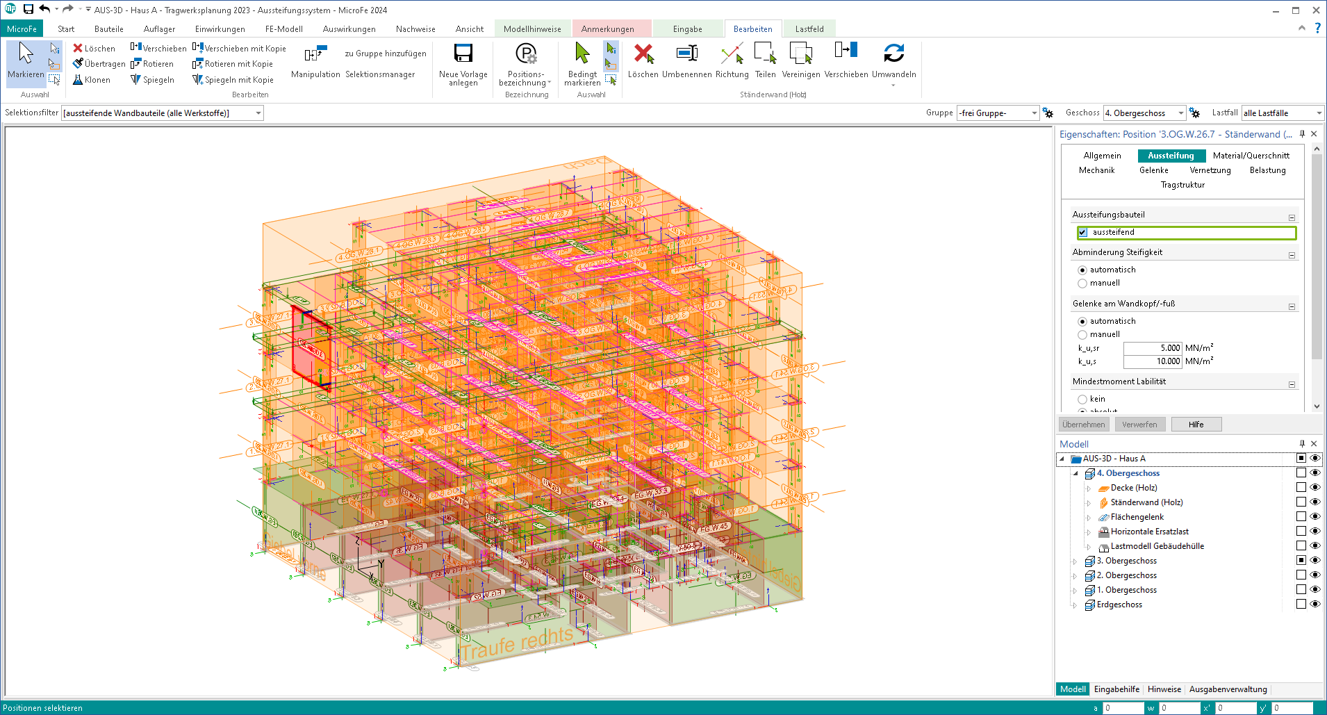 Bei der Modellierung des Aussteifungstragwerkes mit M130.de wird für Stützen- und Wandbauteile in den Positionseigenschaften im Register "Aussteifung" festgelegt, ob sich diese am Abtrag der Horizontallasten beteiligen sollen. So sind beispielsweise kurze Wände in Bezug auf die Aussteifung wenig wirksam und können gezielt aus der Lastverteilung der Horizontallasten ausgeschlossen werden. Aus dieser Festlegung ergeben sich entsprechende Annahmen zur mechanischen Modellierung. Die in den Vorlagen automatisch gesetzten Eigenschaften zur Erzielung des gewünschten Tragverhaltens sind auf die Besonderheiten der verschiedenen Werkstoffe abgestimmt. Alternativ kann die Modellierung durch Wahl manueller Steifigkeitsabminderungen und manueller Gelenkdefinitionen individuell angepasst werden. Eine ausführliche Darlegung der Vorlagen für die Materialien Stahlbeton und Mauerwerk können [2] und für Brettsperrholz [3] entnommen werden.