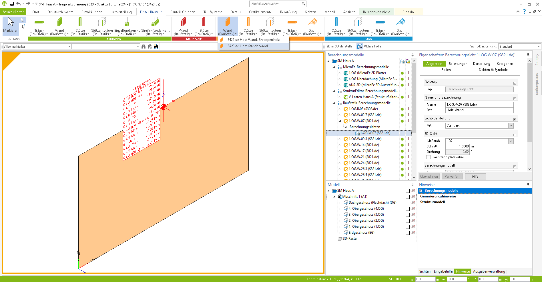 Bei Verwendung des StrukturEditors kann im Register "Einzel-Bauteile" ein Berechnungsmodell für den Wandnachweis mit S423.de angelegt werden. Belastungen aus Plattenberechnungen und der Aussteifungsberechnung können dann mit wenigen Klicks auf das nachzuweisende Bauteil übernommen werden.