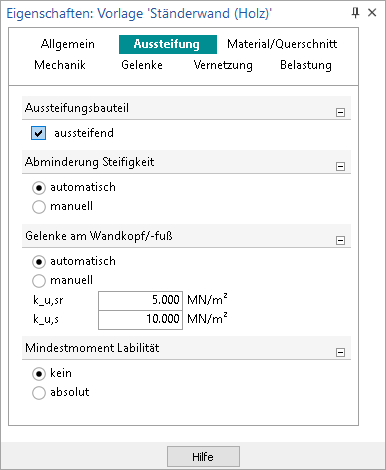 Die aussteifende Wirkung von Wänden beruht vorwiegend auf deren Scheibentragwirkung. In Plattenrichtung ergibt sich nur ein geringer Beitrag zur Steifigkeit des Gesamtsystems. Ein nahezu reines Scheibentragverhalten der Holz-Ständerwände wird durch die Anordnung von Momentengelenken an Wandkopf und Wandfuß erzielt. Zur Vermeidung beweglicher Systeme werden kleine Reststeifigkeiten für diese Gelenke generiert.