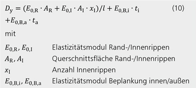Analog wird die Normalsteifigkeit Dy unter Berücksichtigung der Beplankung, der Rand- und Innenrippen wie folgt berechnet: