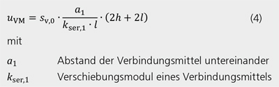 Die horizontale Verformung infolge der Nachgiebigkeit der Verbindungsmittel wird nach Gleichung (4) bestimmt. Zur Ermittlung des Verschiebungsmoduls kser,1 werden Angaben zu Verbindungsmittelart, -abstand und -durchmesser sowie zur mittleren Rohdichte der miteinander verbundenen Holzwerkstoffe benötigt.