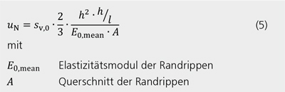 Die Normalkraftbeanspruchung der Rippen führt ebenfalls zu einer Verschiebung des Wandkopfes. Unter der Annahme einer kontinuierlichen Lasteinleitung der Last H in die Kopfrippe können die Verformungsanteile von Rähm und Schwelle vernachlässigt werden. Die Verformung kann in ausreichender Näherung folgendermaßen bestimmt werden: