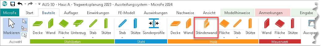 Für die Bemessung der Holz-Ständerwände ist das BauStatik-Modul "S423.de Holz-Ständerwand" vorgesehen. Über Einbindung des Modells mit S019 in die BauStatik können aus M130.de der Wandaufbau sowie die Beanspruchungen infolge Horizontallasten übernommen werden. Übergeben werden die Scheiben- und Plattenbeanspruchungen am Wandfuß. Beanspruchungen infolge vertikaler Belastung können aus Plattenbemessungen per Lastabtrag ergänzt werden.