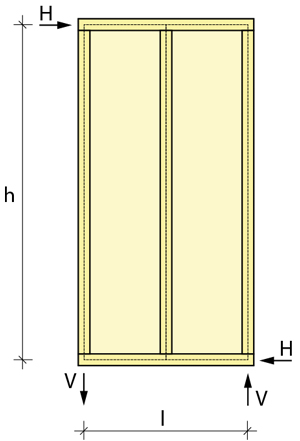 Eine am Wandkopf angreifende Kraft H wird über den Rähm kontinuierlich in die Beplankung eingeleitet. Über eine gleich große Gegenkraft wird die Last H an der Schwelle aufgenommen. Der zugehörige Schubfluss sv,0 am oberen und unteren Rand beträgt: