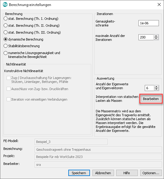 Da zusätzliche Massen Einfluss auf die Eigenformen haben, müssen diese bereits vor der dynamischen Analyse des Systems angelegt und mit dem entsprechenden Faktor ψE bei der dynamischen Analyse berücksichtigt werden (siehe oben). Die Lastfälle vom Typ 'nur als Masse zu berücksichtigen werden nur bei der dynamischen Berechnung zur Berücksichtigung zusätzlicher Massen angesetzt, nicht aber bei der anschließenden statischen Berechnung.