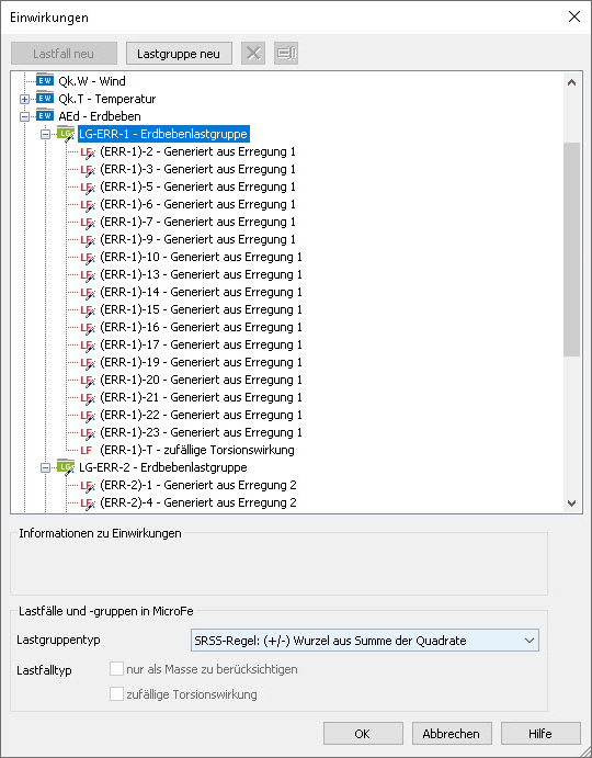 Die erstellten Ersatzlasten werden je Erregung (x- bzw. y-Richtung) automatisch zu einer Erdbebenlastgruppe vom Typ „+/- Wurzel aus Summe der Quadrate“ zugeordnet (siehe Abbildung oberhalb).