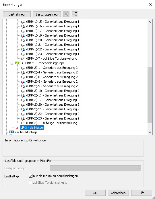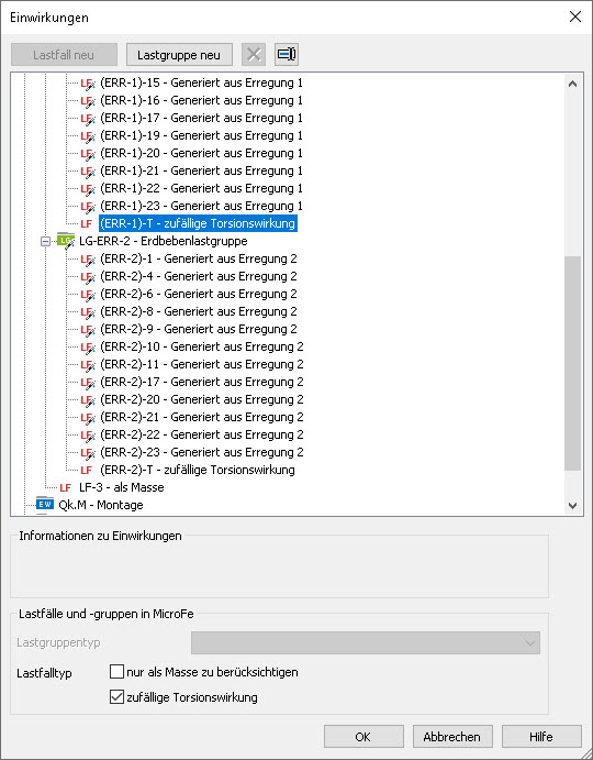 Nach DIN EN 1998-1 ist beim Erdbebennachweis ein zufällige (nicht planmäßige) Torsionswirkung zu berücksichtigen. Diese Beanspruchungen sind nach Abschnitt 4.3.2 und 4.3.3.3.3 der Norm zu ermitteln. In MicroFe ist dies über die Definition von zusätzlichen Lasten je Erregung oder durch Definition von zusätzlichen Massen möglich. Sollen die Beanspruchungen als zusätzliche Lasten berücksichtigt werden, sind diese Lasten den automatisch erzeugten Lastfällen für zufällige Torsionswirkung zuzuweisen (siehe in Abbildung unterhalb z.B. LF (ERR-1)-T - zufällige Torsionswirkung und LF (ERR-2)-T - zufällige Torsionswirkung)).