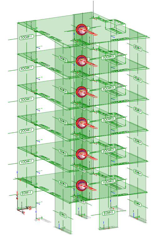 Hinweis: Bei regelmäßiger Geschosshöhe bietet es sich an, durch mehrfaches Kopieren der Erdbebenlastposition des Erdgeschosses die Erdbebenlasten der übrigen Geschosse zu erzeugen. Dabei werden die Koordinaten des Auswertungsbereiches entsprechend angepasst. In einem Geschossmodell sollte nach dem Kopieren die Geschosszugehörigkeit der neuen Erdbebenlasten angepasst werden (Eigenschaften der Erdbebenlast, Kapitel „Allgemein“, Frage „Geschoss“).