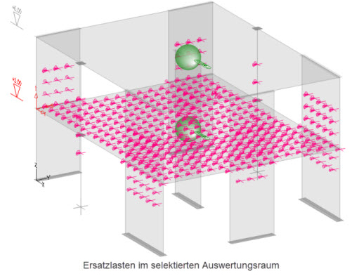 Die Ersatzlasten werden in jedem Finiten-Elementknoten im Auswertungsraum dargestellt (siehe untenstehendes Bild). Diese Ersatzlasten bleiben bei einer nachträglichen statischen Berechnung erhalten.