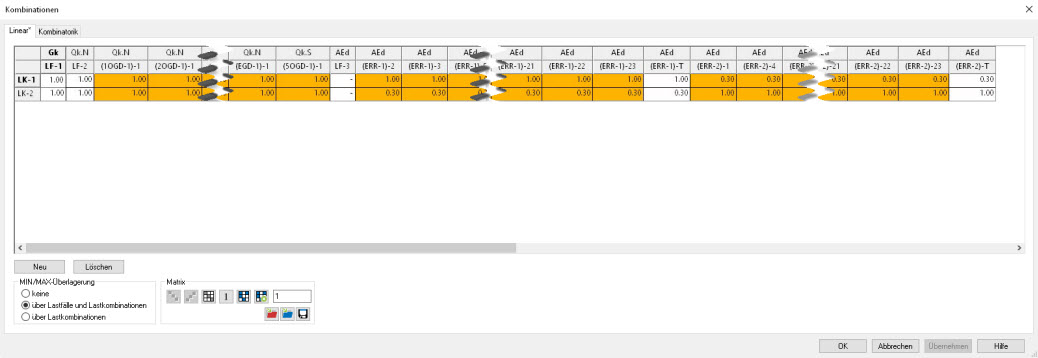 Hierzu sind die linearen Lastkombinationen vorzugeben und die 'MIN/MAX-Überlagerung über Lastfälle und Lastkombinationen' zu wählen. Dabei ist darauf zu achten, dass alle Lastfälle einer Erregung den gleichen Lastfaktor erhalten.