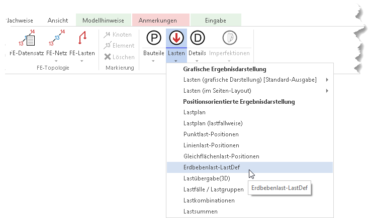 Die Ausgabe „Erdbebenlast-LastDef“ ist im Register „FE-Modell“ unter der Auswahlschaltfläche „Lasten“ zu finden: