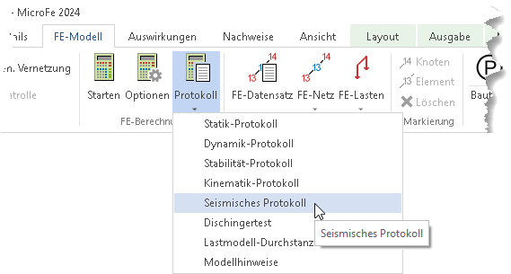 Mithilfe der Auswahlschaltfläche "Protokoll" im Register "FE-Modell" des Menübandes ist es unter "Seismisches Protokoll" zu finden.