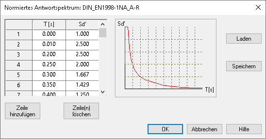 ·         Unter Spektrum ist das Bemessungs-Antwortspektrum, das als Grundlage für die Erregung dienen soll, anzugeben. Durch einen Klick auf den Pfeil wird der Dialog „Normiertes Antwortspektrum“ aufgerufen, um ein Spektrum zu laden oder ein neues Spektrum zu erstellen und zu speichern. Die Wertepaare Eigenperiode T[s] und die Beschleunigung S'd werden in Tabellenform ausgewiesen und das Antwortspektrum grafisch ausgewertet. Nach DIN EN 1998-1/ NA stehen sechs normierte Antwortspektren (A-R, B-R, C-R, B-T, C-T und C-S) zur Verfügung. Für das Beispiel wird das Normierte Antwortspektrum nach DIN EN 1998-1/ NA für die Baugrundklasse A-R verwendet: