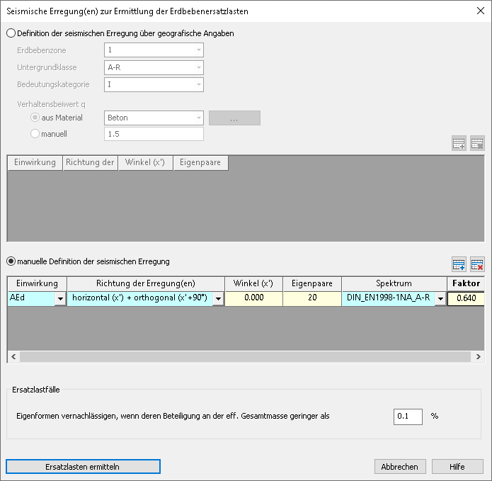 Für die Festlegung der seismischen Erregung sind im Dialog „Seismische Erregung(en) zur Ermittlung der Erdbebenersatzlasten“ folgende Parameter zu belegen: