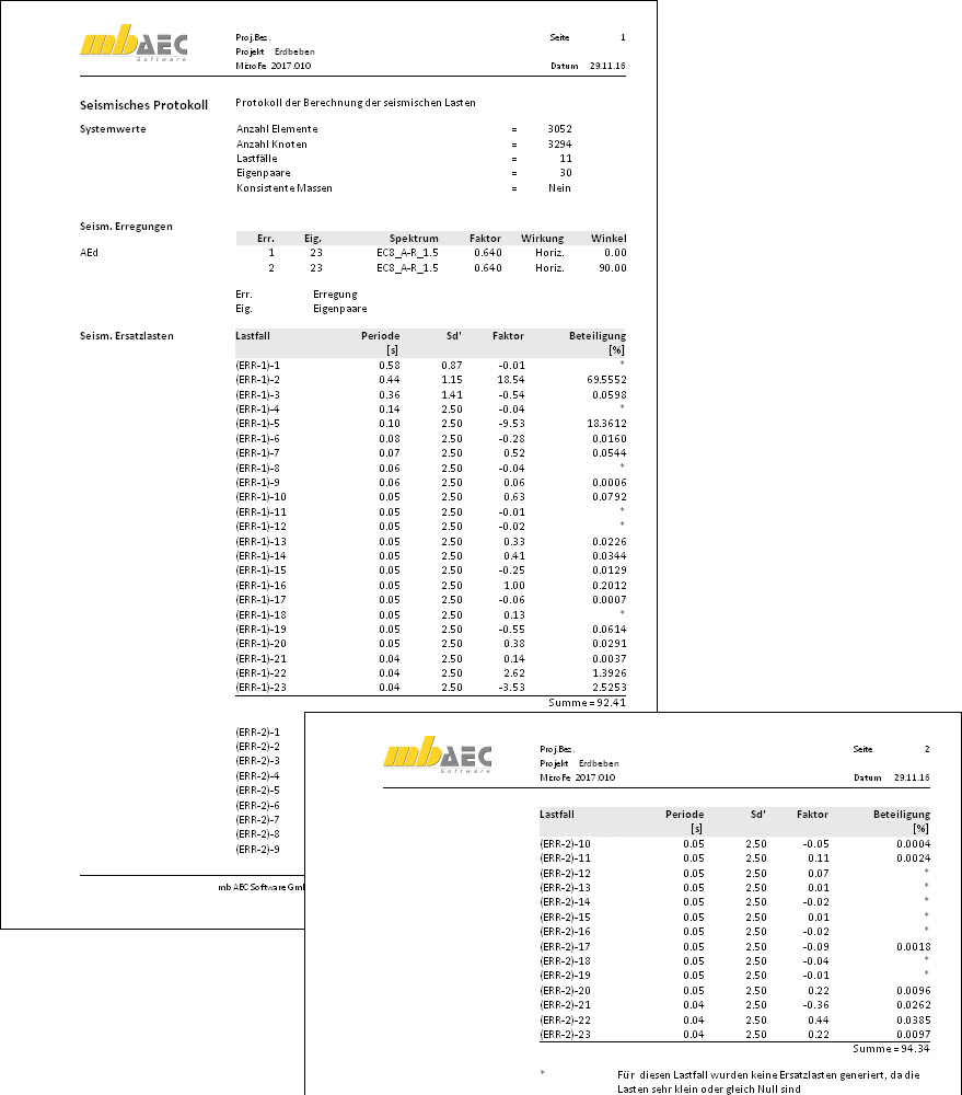 Das erstellte Berechnungsprotokoll dient zur Kontrolle der eingegebenen Erregungen und zur Beurteilung des Einflusses der einzelnen Eigenformen. Für jede Erregung werden die generierten Lastfälle protokolliert und die Beteiligung der jeweiligen Eigenform in [%] ausgewiesen. Nach Norm sind so viele Eigenformen zu berücksichtigen, dass die Summe jeweils mindestens 90% beträgt.