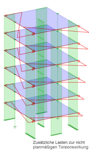 Im nächsten Bild sind beispielhaft die Lasten zur Berücksichtigung der nicht planmäßigen Torsionswirkung als Trapezlasten auf der Geschossebene je Erregung angesetzt. Soll die Berücksichtigung der nicht planmäßigen Torsionswirkung über zusätzliche Massen erfolgen, so kann dies durch die Definition von Punkt-, Linien- oder Flächenlasten erzielt werden.