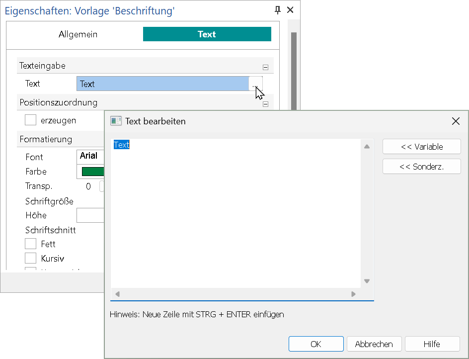 In der zugehörigen Optionenleiste kann eine Vorlage für die Beschriftung gewählt werden. Die Eingabe des Textes erfolgt über das Kapitel „Text“ im Fenster „Eigenschaften“.