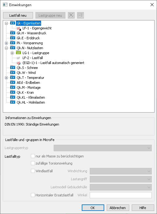 Eine neue Lastgruppe wird, analog zum neuen Lastfall, über den Schalter "Lastgruppe neu" angelegt. Nach dem Auswählen einer Lastgruppe kann im unteren Bereich des Dialogs in der Gruppe "Lastfälle und -gruppen in MicroFe" der Lastgruppentyp beeinflusst werden.