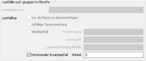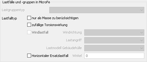 Für Lastfälle, die einer Erdbebeneinwirkung zugewiesen wurden, ist es über die entsprechenden Schalter möglich, diese "nur als Masse zu berücksichtigen" oder eine "zufällige Torsionswirkung" zu aktivieren. Siehe hierzu auch Erdbebennachweise in MicroFe.