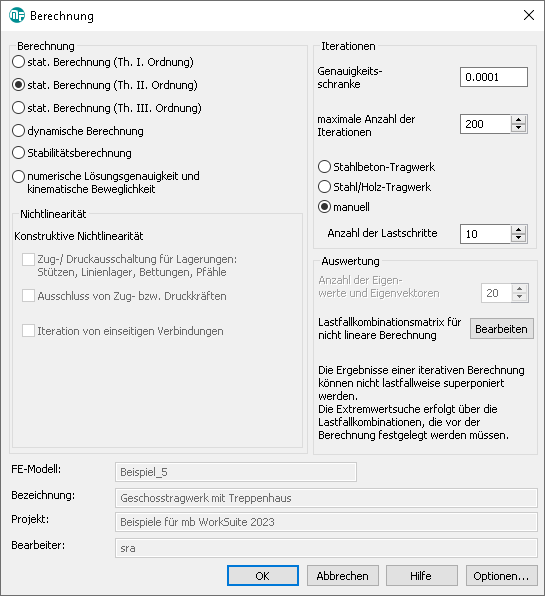 Über das Register "FE-Modell" erreichen Sie mithilfe der Schaltfläche "Optionen - Berechnung" den Dialog "Berechnung". Hier können Sie die Einstellungen zur Berechnung vornehmen.