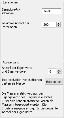 Die Berechnung erfolgt für die gewählte Anzahl der Eigenwerte / Eigenvektoren (festzulegen im Feld "Auswertung"). Für die einzelnen Eigenwerte wird die übliche Unterraumiteration durchgeführt.