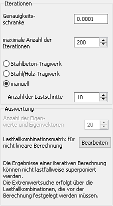Für nichtlineare statische Berechnungen können Sie die Genauigkeitsschranke und die maximale Anzahl der Iterationen festlegen. Diese beiden Werte bestimmen das Abbruchkriterium der Berechnung. Die Genauigkeitsschranke wird für eine Berechnung nach Theorie II. und Theorie III. Ordnung benötigt.