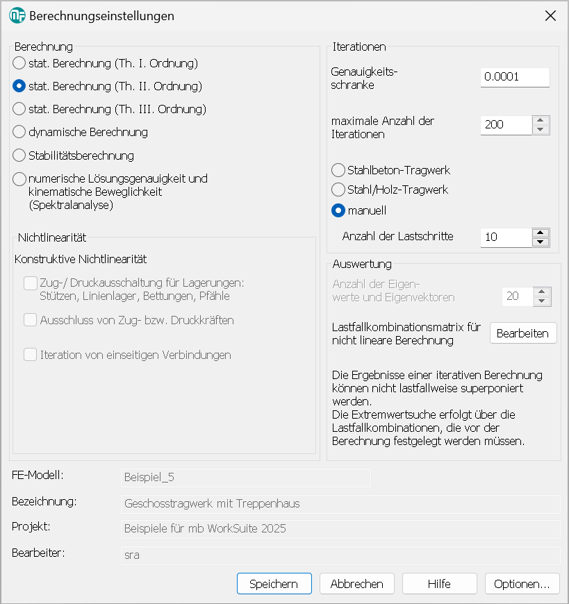 Ist zum Beispiel "automatische Knicklängenermittlung" eingestellt, so wird für den Knicknachweis eine temporäre Stabilitätsberechnung durchgeführt. Für diese Berechnung werden die Einstellungen aus diesem Dialog verwendet.