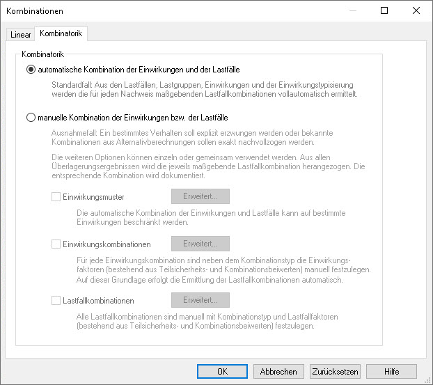 In diesem Dialog legen Sie fest, welche Lastfallkombinationen zur Bemessung des Modells herangezogen werden sollen. Es stehen zwei Möglichkeiten der Kombinationsbildung zur Verfügung: