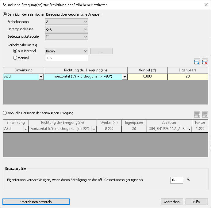 Die Definition der seismischen Erregung kann wahlweise manuell oder über die Vorgabe von geographischen Angaben erfolgen. In diesem Fall wird das Antwortspektrum anhand der gemachten Angaben nach DIN EN 1998-1 NAD ermittelt.