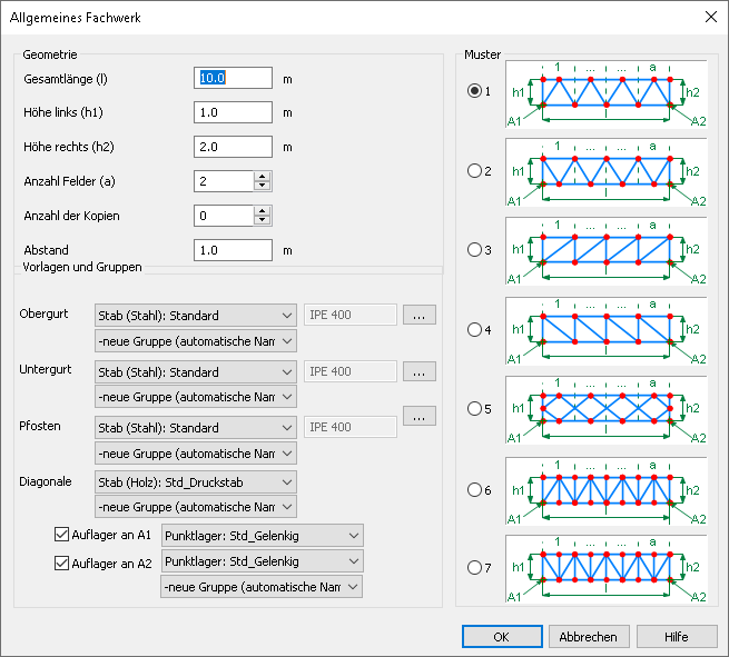 Hier wählen Sie aus, welche Diagonalen- und Pfostenanordnung das Fachwerk besitzen soll.