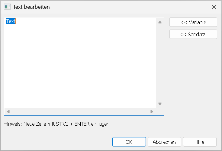 Geben Sie in diesem Dialog den gewünschten Text vor. Über die Schaltflächen auf der rechten Seite können Variablen und Sonderzeichen eingefügt werden.