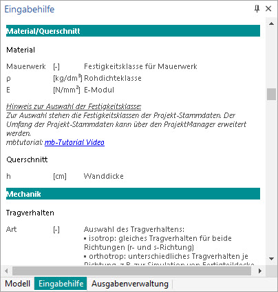 Durch die flexiblen Gestaltungsmöglichkeiten der Oberfläche könnte das Fenster „Eingabehilfe“ nicht sichtbar sein. Mit einem Klick auf den Hilfe-Schalter im Fenster Eigenschaften wird die Eingabehilfe angezeigt oder geöffnet. Falls über die Eingabehilfe hinaus weitere Informationen wie Texte in der Onlinehilfe oder mb-Tutorial-Videos vorliegen, werden diese über weiterführende Links erreicht.