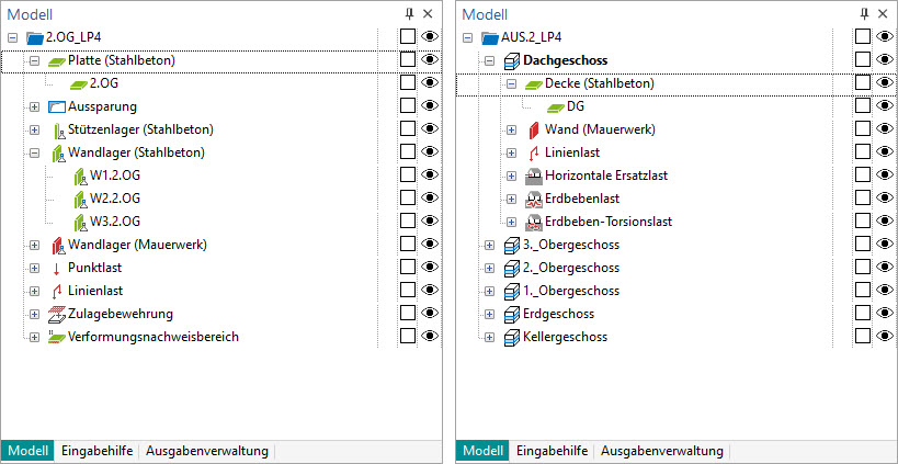 Für ein 2D-Platten- oder 2D-Scheiben-Modell werden hier auf erster Ebene die Positions- und Lasttypen angeboten. Wird die Struktur weiter geöffnet, erscheinen die einzelnen Positionen des Modells. Für 3D-Geschossbaumodelle werden die Geschosse als weitere Hierarchie-Stufe angeboten.