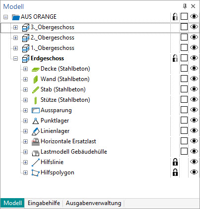 Am rechten Rand des Fensters „Modell“ ermöglichen die Auge-Symbole eine schnelle Steuerung des Darstellungsumfangs. Mit einem Klick kann wahlweise ein Geschoss, eine Kategorie oder eine einzelne Position unsichtbar geschaltet werden.