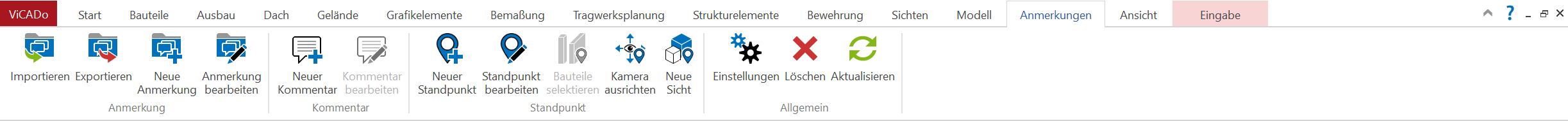 Im Register "Anmerkungen" werden alle Optionen zur Verwaltung und Erzeugung von Themen, Anmerkungen und Standpunkten aufgelistet.