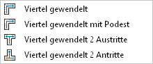 Über diese Auswahlschaltfläche können unterschiedliche viertelgewendelte Treppen erzeugt werden. Die Standardeinstellung ist 'viertel gewendelt'. Eingabeoptionen stehen in der Optionenleiste zur Verfügung.