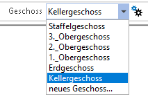 Neue Geschosse können direkt über den untersten Eintrag der Auswahlliste erzeugt werden. Das Zahnradsymbol öffnet die Geschosseigenschaften. Dort können Geschosse gelöscht, umbenannt oder mit einer Bemerkung ausgestattet werden.