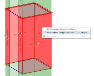 Alternativ kann nach der Selektion der zu gruppierenden Positionen im Zeichenfenster über das Kontextmenü der Befehl „Position(en) zu Gruppe hinzufügen…“ aufgerufen werden. Hier können die Positionen zu einer bestehenden Gruppe hinzugefügt oder eine neue Gruppe angelegt werden. Das Entfernen einer Position aus einer Gruppe lässt sich nur in den Positionseigenschaften vornehmen.